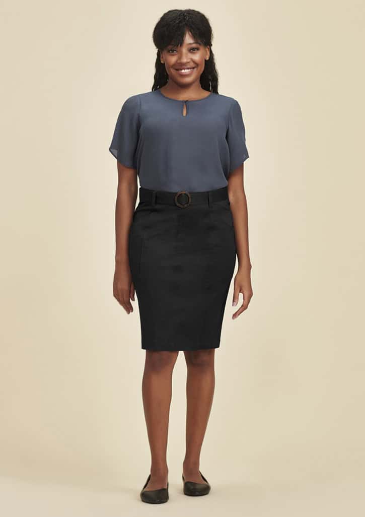 - A modern Chino skirt featuring functional back split, non-gaping side seam pockets, metallic back zip feature, belt loops and modern trims. Pencil shape designed to finish mid length, but will vary depending on wearers height. Detachable belt included. Fabric has added stretch for comfort and easy movement