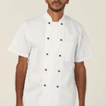 Turn to the Chef Works Basic Chef Jacket for a classic workwear piece that’s designed to perform. The smart, short-sleeved style is crafted from a superior poly-cotton blend that’s both durable and wrinkle resistant. Five rows of black stud buttons lend a professional finish, while a thermometer pocket on the left chest boosts practicality. A neat standing collar completes the classic and polished look.