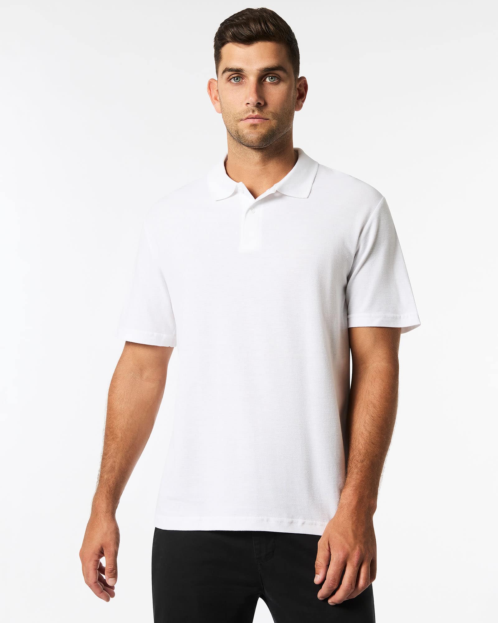 Construction:Short sleeve collared polo shirt, 2 button placket, tonal buttons, split detail at sides, side seamed, double needle hems, preshrunk to minimise shrinkage